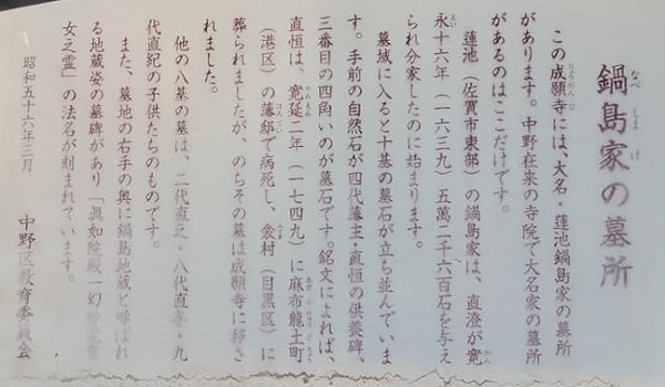 成願寺には鍋島家(蓮池鍋島家)の墓所もあり、開創時から中野区内にある寺院で大名家の墓所があるのは成願寺だけとのことです。