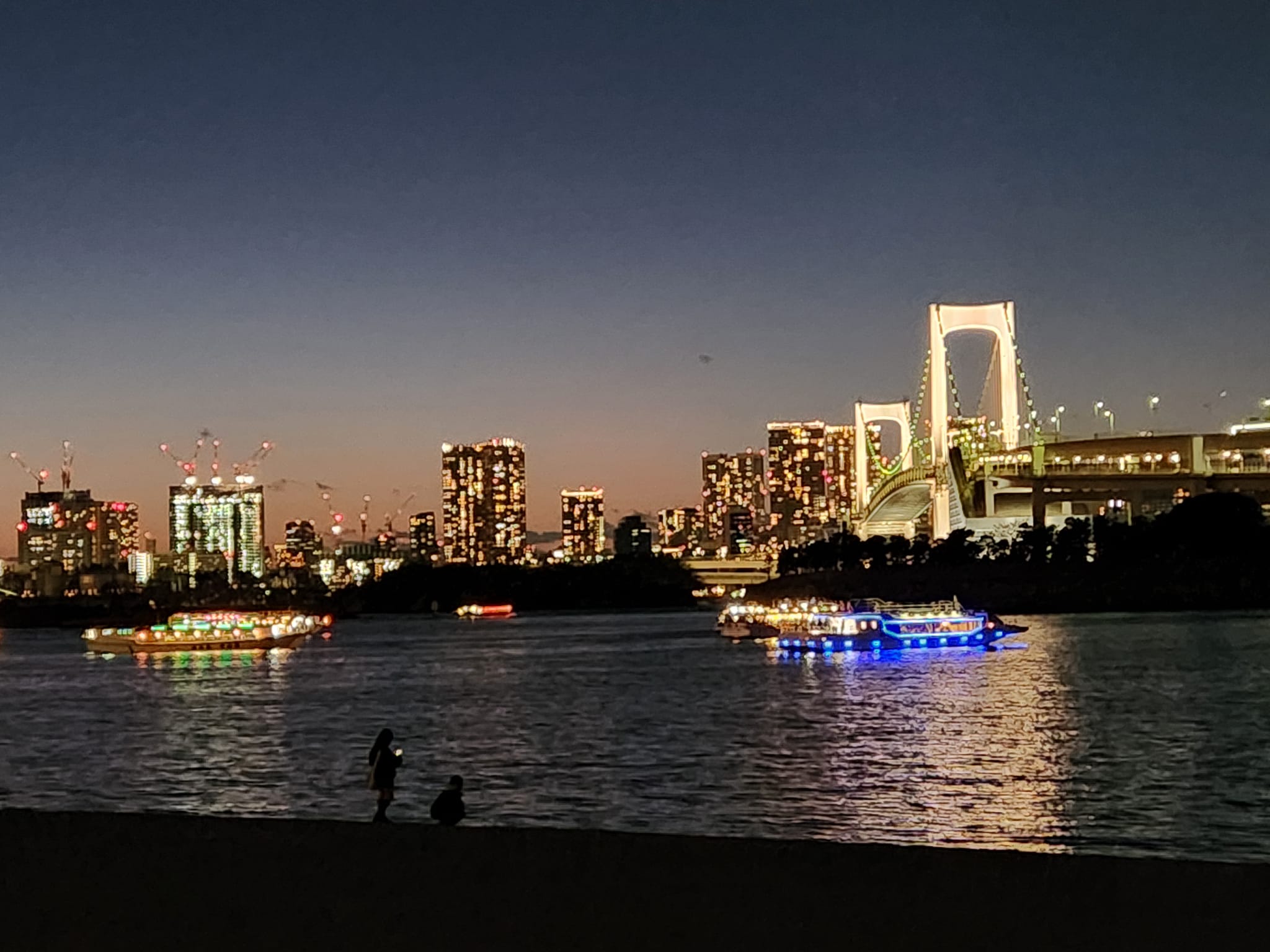 お台場海浜公園からレインボーブリッジを望む。
