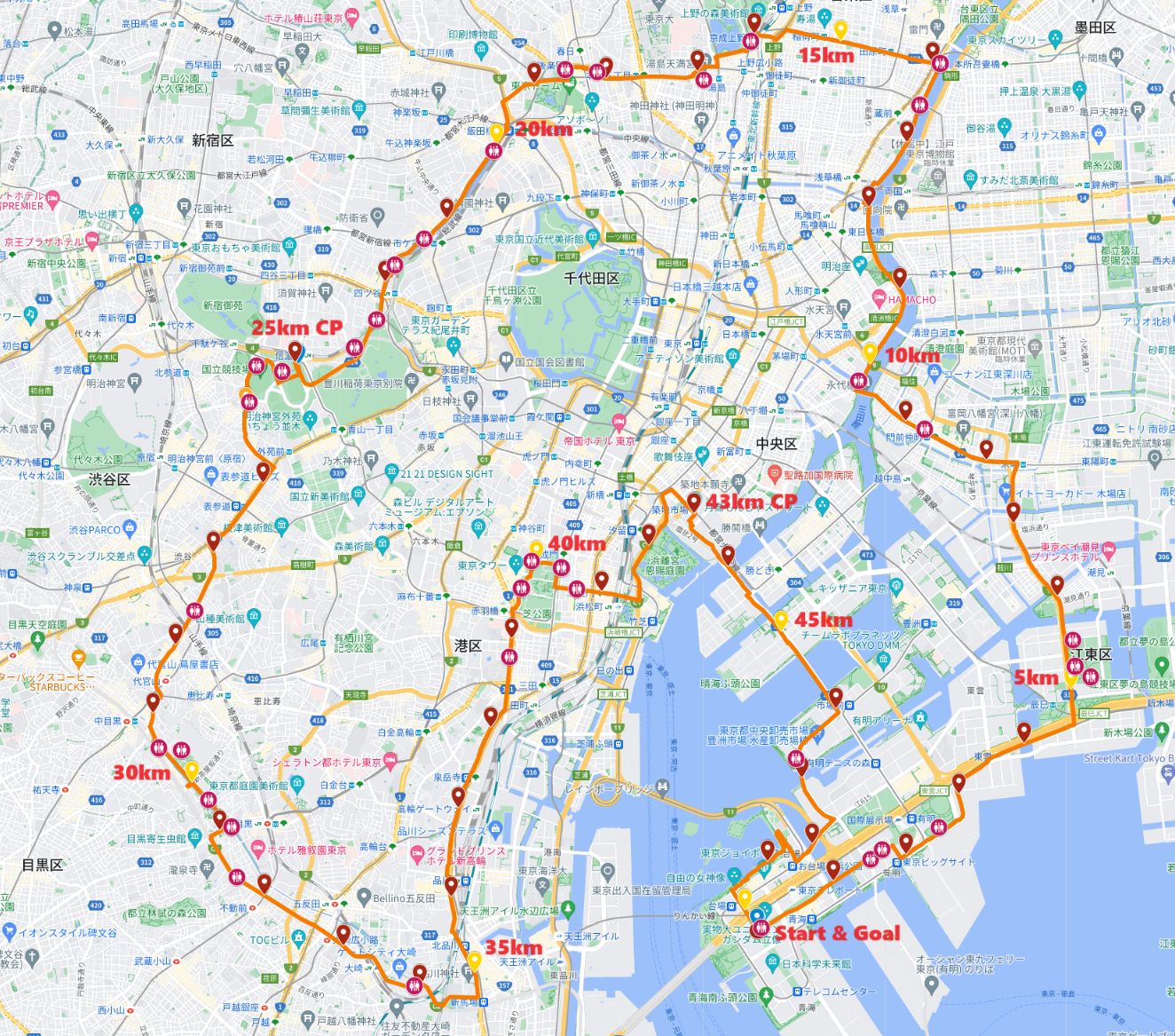25qチェックポイントからは国立競技場、青山通り(青山学院大前もコース内で!)、代官山を経て目黒川沿いへ。